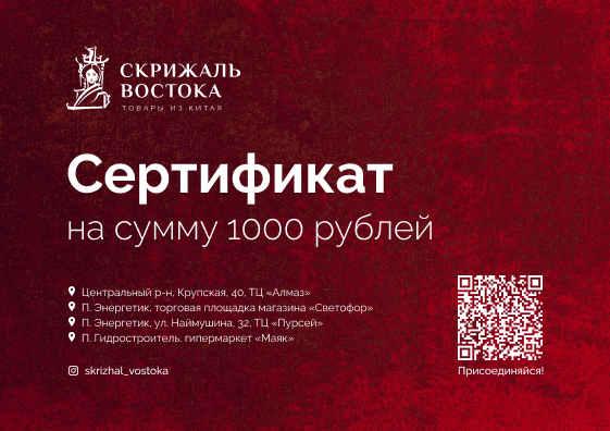 Сертификаты номиналами 1000₽, 3000₽, 5000₽ можно приобрести по адресам: Центральный р-н, Крупская, 40, ТЦ «Алмаз» П. Энергетик, торговая площадка магазина «Светофор» П. Энергетик, ул. Наймушина, 32, ТЦ «Пурсей» П. Гидростроитель, гипермаркет «Маяк»